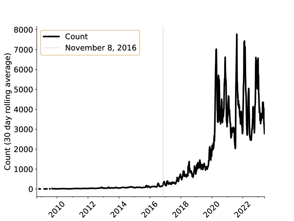 Figure 1: Count of the word “misinformation” in Alshaabi et al. Twitter data. The date of the 2016 US Presidential Election appears to roughly coincide with the beginning of a new trend of growth.