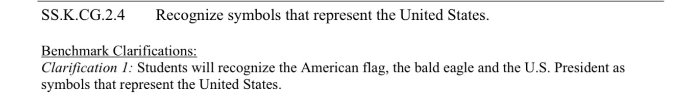 An especially fascinating standard has to do with “understanding symbols” and the place of symbols in the national narrative. Social psychologists have researched the role of national symbols across nations and cultures and across historical formations, including the role of the flag in Germany’s history, and have found that flags, according to social identity theory, serve the primary function of differentiating the country’s own people from out-groups and, though they can arouse positive feelings for a nation, can also heighten biases and prejudices. Another recurrent theme in this literature is the increased frequency of appearance and amplified salience of the flag during national identity crises. Here is Florida’s standard during our national identity crisis: