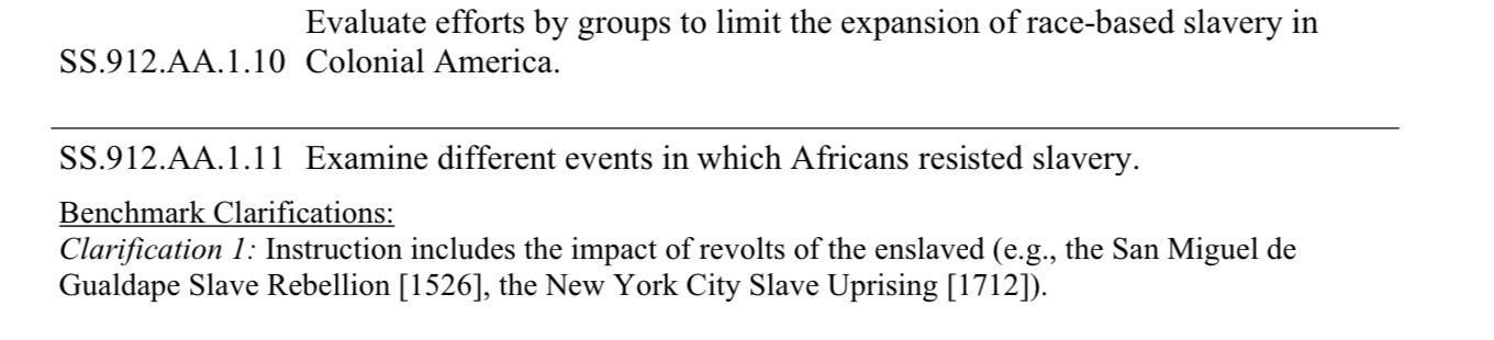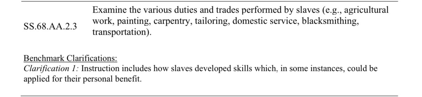 In essence, according the the story put forth in the Florida standards, the colonists even before 1619 had been coerced into using African slaves by the English monarchy. They didn’t want to buy African slaves; they could have done with indentured servants or by making laborers of indigenous people. Of course, most colonists recognized it as malevolent, but what could they do? Following the Revolution (which was fought over unfair taxation, mind you, which still goes on today) stout-hearted White men stood against the evil of slavery by installing into the Constitution the three-fifths compromise and a time certain for the end of the slave trade (1808). Mr. DeSantis and his School Board insist that Americans knew all along slavery cuts against promises of equality and justice. For example, consider the following standard, and note the clarifications added to the standards document recently in 2023: