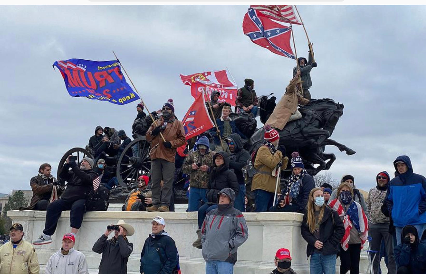 I’m not sure what exactly to make of the following photo as a pedagogical device (I’d need to sit with it for a bit) nor whether I could use it in class if I were teaching eighth grade history in Miami (historian Eric Foner could help us here to disentangle issues if we were a history faculty debating its risks in Florida schools), but there are clear linkages in the image between the Confederate flag, the American flag, the bald eagle, and the U.S. President. One can only hope this clarifying concatenation of the Stars and Stripes, the eagle, and Donald Trump wasn’t in the mind of the Board in Florida, suggesting that this U.S. President spelled out in reversed letters is to be revered. Witness2: